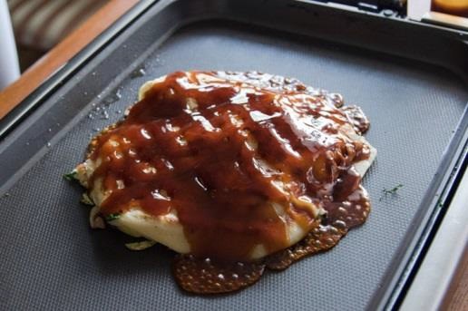 ユリアのお母さんが作ったお好み焼は、ジャガイモやチーズ、マッシュルームがたっぷり -
