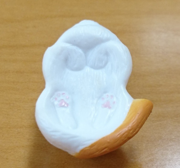一つ買うと、給湯ポットとチャシロ柄のネコが出てきた。給湯ポットとネコは独立しており、ネコの裏側はポットの曲線にフィットする形にへこんでいる。畳んだ前脚と後ろ足の肉球まで完全再現してある。