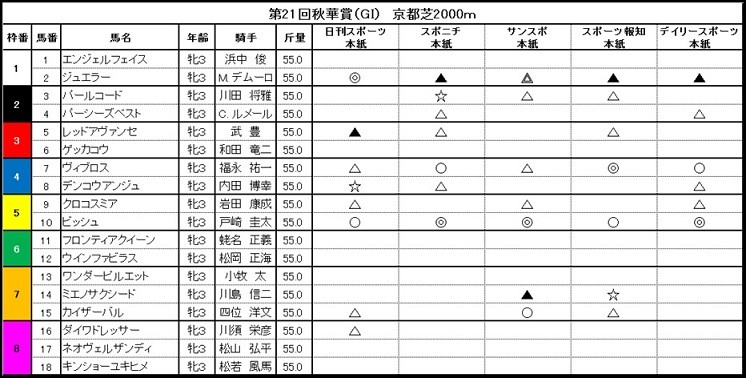 スポーツ5紙で、ジュエラーに本命、◎を打ったのはなんと日刊スポーツだけ。オークス馬、シンハライトと「春のレースを振り返れば、ほぼ互角の能力を発揮していた」と、高く評価する。前走は大敗したが、京都の内回りコースを想定して「先行策を試した点にデムーロ騎手のしたたかさがうかがえる」とみた。他の4紙は、単穴(3番手)の評価にとどめている。