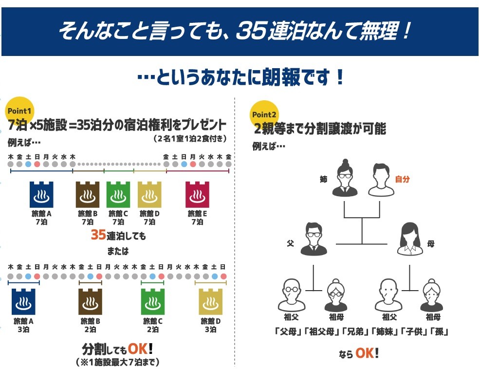 プレゼントの特徴は、「7泊分×5施設」、「2親等まで分割譲渡可能」という点だ。1つの施設につき7泊分の宿泊権、1回の滞在期間を「週末を利用して2泊ずつ」といった具合に細かく分割消化できる。そして2親等までなら宿泊権利を譲渡できるので、「両親に温泉旅行をプレゼントしたい」、「孫との二人旅をしたい」といった使い方も。もちろん、35泊分を一括で連続消化することも可能だ。