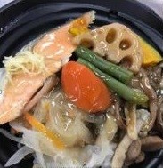 たとえば「鮭と野菜のあんかけ丼」は、麦ごはんに鮭と野菜をのせ、和風のあんかけでとろみをつけた弁当に仕上げられている。また、バランスよく根菜類を取り入れることで、噛む回数を増やそうとする狙いもあるという。