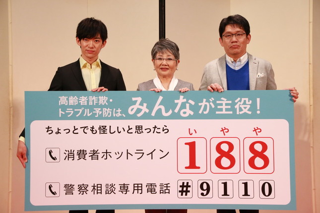 女優の泉ピン子さん(69)とお笑いコンビ「ずん」の飯尾和樹さん(47)、メンタリストのDaiGoさんが2016年11月16日、都内の浅草フランス座演芸場東洋館で行われた「高齢者詐欺・トラブル予防啓発PRイベント」に登場し、高齢者に多い特殊詐欺のトラブルについてトークを交わした。