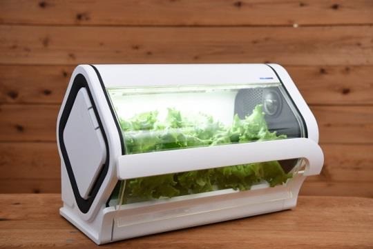 水耕栽培キットはさまざまな企業が商品化しているが、IoT技術を活用したものは「やさい物語」が日本初とのこと。虫が入りにくいよう扉を付けた半密閉タイプで、植物の光合成に必要な光はLEDから照射される。