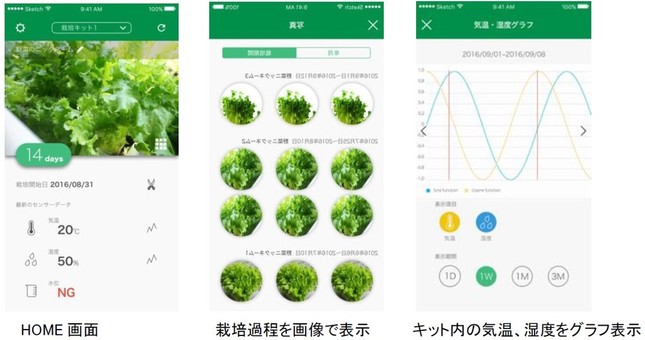「やさい物語」は、スマートフォンアプリを通じて、リーフレタスなど野菜の成長過程を楽しみながら、土を使わず新鮮でおいしい野菜を誰でも簡単に栽培することができる。内蔵カメラから送られる画像データやキット内の気温・湿度・水位を、外出先からチェックすることも可能だ。
