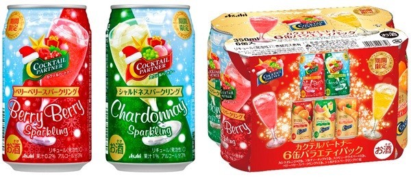 アサヒビールは「アサヒカクテルパートナー」から、期間限定フレーバーとして「ベリーベリースパークリング」と「シャルドネスパークリング」(いずれも350ml缶)の2種と、この2種と定番フレーバー3種詰め合わせた6缶入りの「クリスマスバラエティパック」を2016年11月22日から発売する。