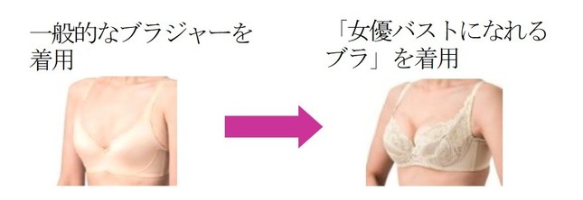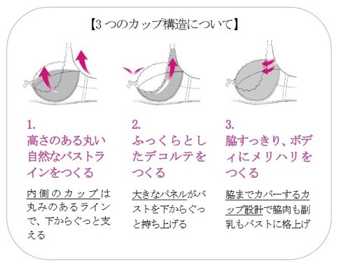 ボリューム感のある丸胸とデコルテをつくる3つのカップ構造で、女優のような理想的なバストに近づけるという。1つ目は、高さと丸みのあるバストラインをつくる内側のカップ。2つ目は、バストを下から引き上げてふっくらとしたデコルテをつくる大きなパネル。3つ目は、脇肉や副乳のはみ出しを防ぎバストに格上げするカップ設計。