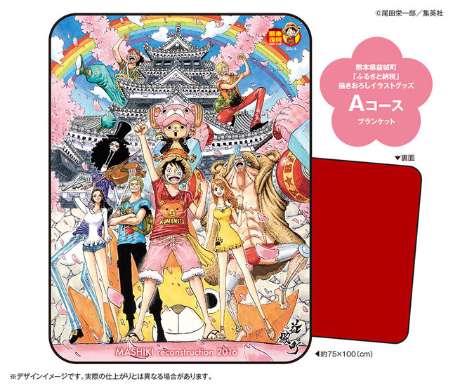 プロジェクト第2弾が12月1日にスタートした。熊本市の東隣に位置する益城町(ましきまち)に1万円以上のふるさと納税をすると、尾田さん描きおろしのイラストを使用したお宝アイテムが返礼品として贈られる。