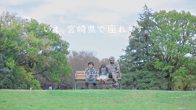 ラストシーンは、温水像が座る「ひなたぬくぬくベンチ」で子どもたちが遊びたわむれる、あたたかくてハートフルな映像で幕を閉じる。