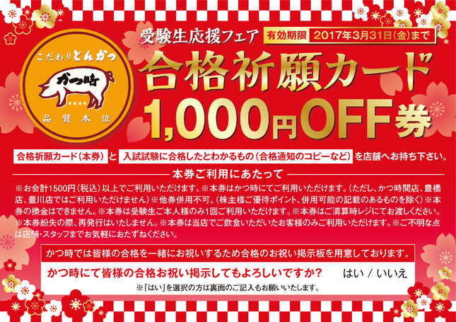 アトムは、とんかつ専門店「こだわりとんかつ かつ時」で、2017年1月10日から「アゲろ!受験生応援フェア」を開始した。