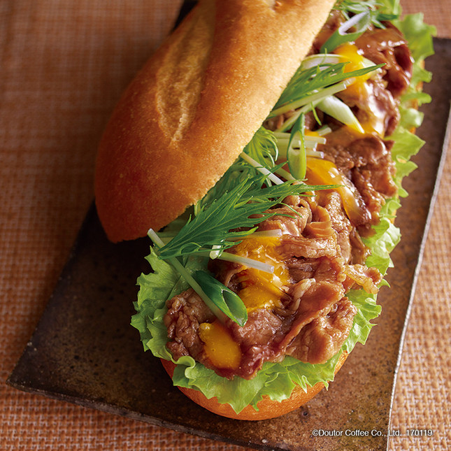 1品目は、パンにレタスや肉などの具材を挟んだミラノサンドの新作「ミラノサンド すき焼き」。すき焼きに着想を得て生まれたサンドで、シャキシャキとしたレタスに甘辛く味付けされた牛肉、タマネギ、卵黄のソース、九条ネギ、水菜が盛り付けられている。価格は410円(税込)。