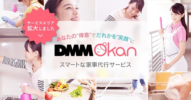オンラインゲームやVOD(ビデオ・オン・デマンド)を手がける「DMM.com」は、家事代行サービス「DMM Okan」(おかん)のサービス提供地域を、2017年3月上旬に東京23区以外にも拡げると発表した。エリア拡大にともない、家事代行の仕事を引き受けたい人(キャスト)の登録を2月20日から受け付けている。
