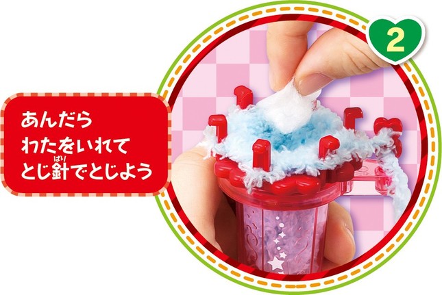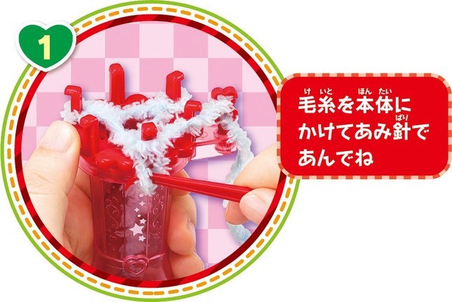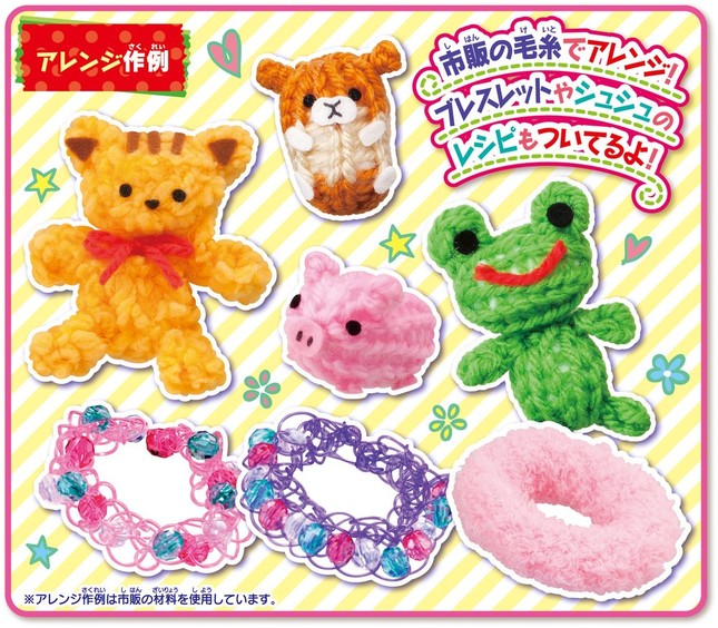 本体に毛糸をセットし、リリアン編みをベースに輪状に編んでいき、"わた"を入れ閉じ、パーツを組み合わせ、フェルトシールで目や鼻、口などをつけるとミニマスコットが完成。3本ピンと6本ピンを使い分けて、様々なタイプのマスコットをバリエーション豊富に作れる。