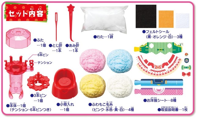 セット内容は、本体(フタ・3本ピン・6本ピン・小物入れ付き)、とじ針、あみ針、わた1袋、ふわもこ毛糸4色各1個、フェルトシール3色各1個、お洋服シート8種各1個。