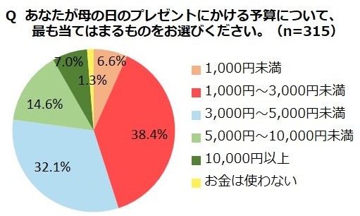 今度は、(母の日のプレゼントを)「毎年贈る」「ほぼ毎年贈る」「数年に一度程度贈る」の回答者に予算を聞いた。「1000円~3000円未満」が一番多く、次いで多かったのが「3000円~5000円未満」だった(図表3)。プレゼントを贈る派の男性は高価なもので頑張りすぎるのではなく、手頃な価格のプレゼントを用意し、感謝の気持ちを伝えているようだ。