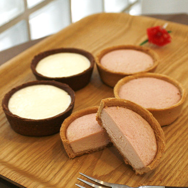 それぞれ直径約7.5センチで5個セット。ミルクレアチーズタルト×2個、ラズベリーチーズタルト×3個。母の日の贈り物にもいいだろう。