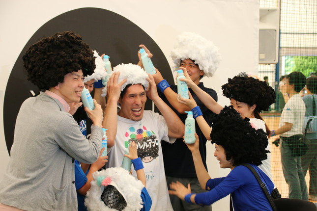 開会式には柔道家の篠原信一さんが出席し、花王のヘアケアブランド「メリット」が開発した新感覚のゆるスポーツ「アフレルアフロ」に挑戦した。「アフレルアフロ」は、3人2チームで遊ぶ玉入れをアレンジしたゲーム。参加者は上部に穴が空いた「親アフロ」をかぶり、90秒間でその穴に投げ入れた「子アフロ」の数を競う。