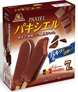「音まで美味しい、濃厚チョコ。」がキャッチフレーズの「パキシエル」(森永製菓)は、分厚いチョコレートでアイスを包んだチョコアイスバーだ。同社独自の製法により実現した厚さ7mmの先端チョコは、まるで板チョコを食べているかのような歯ごたえと音。