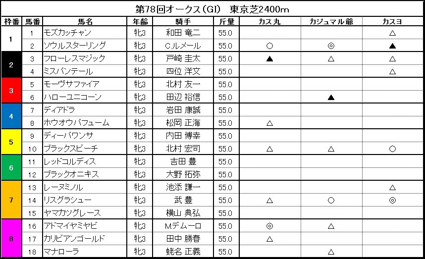 ガジュマル爺 わしはハローユニコーンが単穴▲じゃ。前走、忘れな草賞(阪神・芝2000メートル)勝ち。田辺騎手の乗り替わっての2連勝で、勢いがある。ちなみに、忘れな草賞とオークスを連勝した馬は、古くはチョウカイキャロル(1994年)、エリモエクセル(1998年)、エリンコート(2011年)。それに2015年のミッキークイーンもそうじゃ。あとはマナローラじゃな。負けはしたが2400メートルの距離経験があること、それにハーツクライ産駒らしい切れ味がある。8枠18番と大外に入ったのが気になるがの。