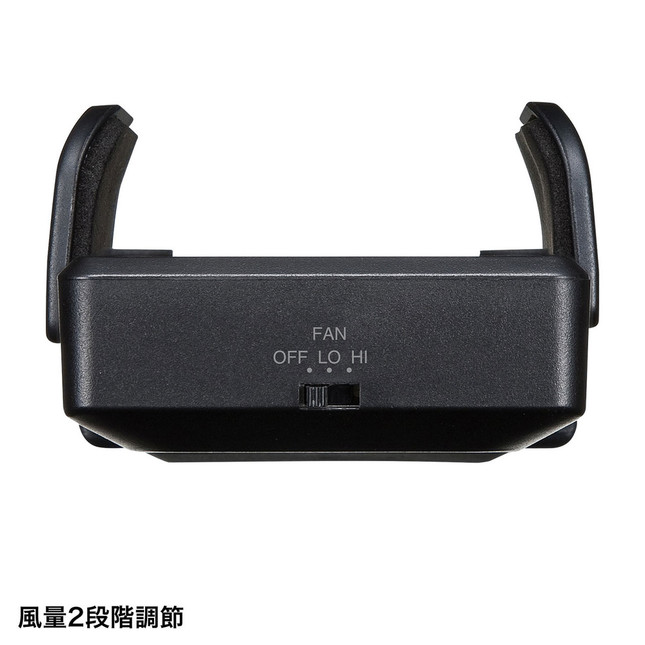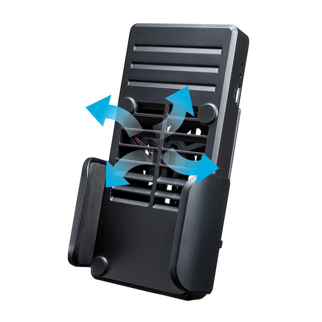 「TK-CLN23」の冷却ファンは7枚の羽を持つ。ファンから生まれる風で熱を逃がし、高温に弱いスマホを守ってくれる。「TK-CLN23」を1時間使い続けた場合、未使用時と比べて約10度の温度差があるという(同社調べ)。風量は2段階で調節可能。ロー(LO)モードで最大約5時間、ハイ(HI)モードで最大約3時間使用できる。