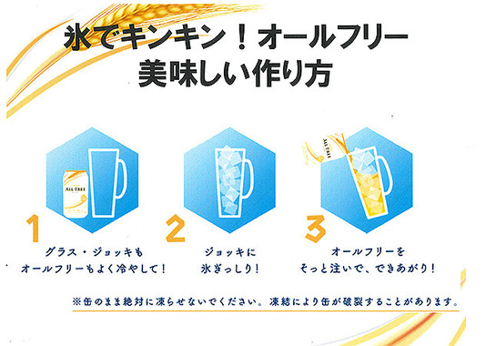 氷で冷えたオールフリーは刺激がアップしていて、氷なしよりも明らかに爽快感で上回っているように感じた。冷えているのでのどごしも上々。氷が溶けても麦の風味は残っていて、ビール感をしっかり楽しむことができた。プラカップや缶で飲むときとは違った印象だ。オールフリーを氷入りのジョッキに注ぐと――なんというか、飲料の持つパワーが若返るかのよう!