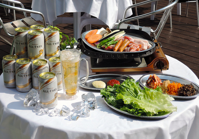 会場ではビアガーデンのメニュー「サムギョプサル」がふるまわれ、来場者は「氷でキンキン!オールフリー」を片手に舌鼓を打った。