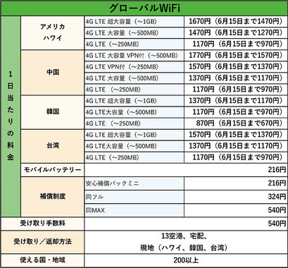 ところで、「JAL ABC」と「Wi-Ho!」の空港カウンターは成田、羽田、関空の3空港のみ。「イモトのWiFi」はその3空港に加え新千歳、中部国際、福岡にもカウンターを設けている。3業者を上回るのが「グローバルWiFi」で、6空港だけでなく旭川、小松、静岡、伊丹、宮崎、鹿児島、那覇をもカバーし、さらにハワイ、韓国、台湾は現地での受け取り・返却も可能だ。