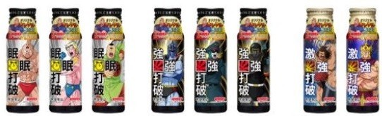 「眠眠打破」シリーズのボトルに「キン肉マン」の人気キャラクター(全8種)が登場。「眠眠打破」300円のボトルには"キン肉マン"のほかに"テリーマン"と"ラーメンマン"が、「強強打破」380円には"ロビンマスク""ブロッケンJr.""ウォーズマン"が、「激強打破」500円には"バッファローマン""アシュラマン"がそれぞれデザインされており、ファンにはたまらないラインアップとなった。