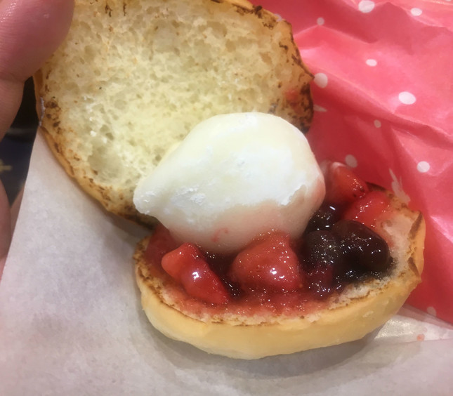 少し肩すかしをくらいながらも、「雪見だいふくプチバーガー(いちごあずき)」を注文し席へ。