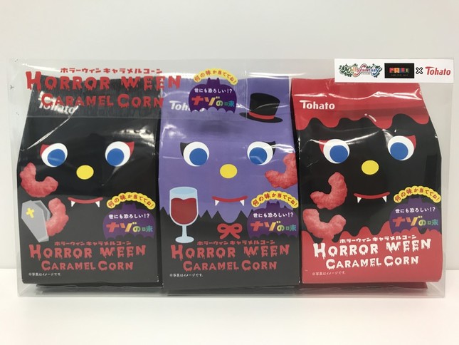 イオンファンタジー系列のクレーンゲームでしか手に入らない数量限定プライズ。ハロウィンのこの時期だけ"怖かわいく"仮装した「キャラメルコーン」が、全3種類のパッケージでハロウィンを盛り上げる。フレーバーは全て「ナゾの味」で、食べてみてからのお楽しみだという。