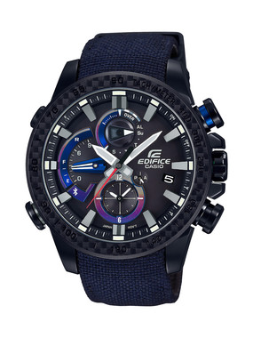 一方の「EFR-557TRP-1AJR」は、ダイアル全体にブラックIP 加工を施すことで、ヒートグラデーションをより際立たせ、スポーティーさを華やかに演出している。