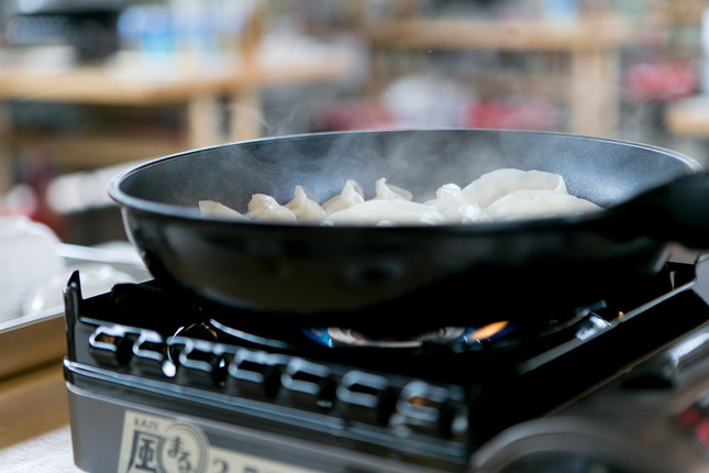 2017年秋、そんなギョーザステーションが札幌と仙台、名古屋、大阪、福岡の5都市を巡る全国ツアーに繰り出す。テーブル上に用意されたガスコンロとフライパンで客自ら味の素の冷凍ギョーザを焼いて食べる形式は、両国駅開催時と変わらない。