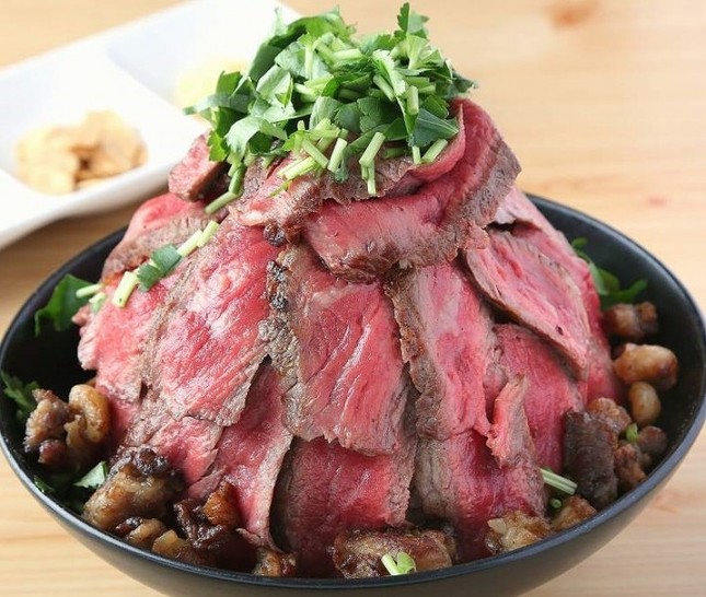 1ポンドサーロインステーキ丼は、肉450グラム、ご飯550グラム総重量1キロの超ビックサイズ。自家製店内仕込みオリジナルソースがよく合った逸品だ。
