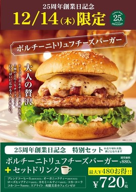 ハンバーガーチェーンのフレッシュネスバーガーは、2017年12月14日に創業25周年を迎えるのを記念し、1日限定で、白トリュフをふんだんに使用した贅沢バーガー「スペシャルポルチーニトリュフチーズバーガー」を数量・店舗限定で発売する。