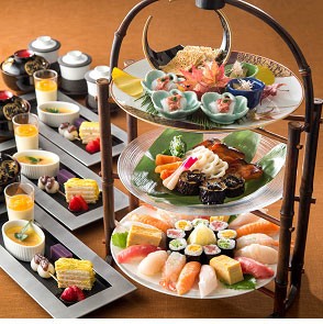 市場の厳選された海の幸をそろえたにぎり寿司をはじめ、季節の味覚を堪能できる小鉢3種や焼き物などを、アフタヌーンティーのように華やかに盛り付けて提供。食後には、和スイーツやプティフール、プティングなどの日替わりデザートを用意している。