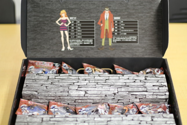 主人公「ルパン三世」をはじめ、「次元大介」「石川五ェ門」「銭形警部」「峰不二子」の各キャラクターのうち1つが商品に付属する。
