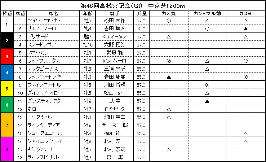 カスヨ わたしは△よ。昨年の勝ち馬だもの、敬意を表すわ。それに、気になるのは香港から参戦しているブリザードね。短距離戦は堅実だし、昨年10月のスプリンターズステークス(GI、中山競馬場・芝1200メートル)も、勝ったレッドファルクスから0.3秒差の5着だったわ。スタートで頭が上がるクセがあったのがなくなってゲートがよくなったらしいから、案外ヤルかもよ。それと、シャイニングレイだわ。前走の阪神カップ(GII、阪神競馬場・芝1400メートル)は18頭立てでビリだったけど、2走前のCBC賞(GIII)は、本番と同じ中京競馬場(芝1200メートル)で、この時1着だったの。きっと中京コースと相性がいいのよ。