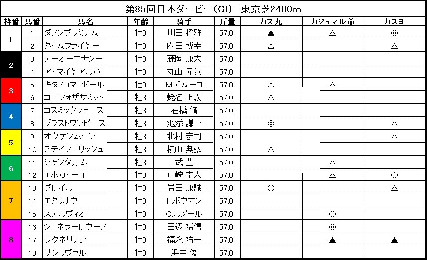 カス丸 うーん、なんだか難解だじぇい。でも皐月賞みたいに、どんどん逃げていく馬はいないみたいだから、流れは速くなりそうもないじぇい。となると、先行有利でカスヨさんの言うとおりダノンプレミアムきゃすう。でも去年のレイデオロみたいに、流れが遅いとみるや、後方勢が早めに仕掛けることもあるじぇい。どっちにころんでも強いやつとなると、先行でも後方待機でもいいブラストワンピースが◎本命だじぇい!しっかり当てるじぇい。
