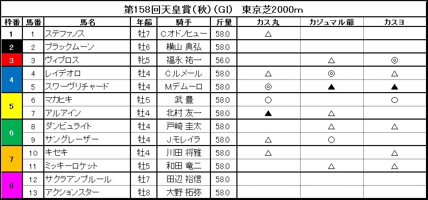 カスヨ カス丸!いつまでもグジグジ言ってんじゃないのよ。競馬は当たるまでやるのよ!当たるまで!分かった?さあ、今週は秋の天皇賞(2018年10月28日、東京競馬場、芝2000メートル)よ。出頭数は少ないけど、久しぶりにトップクラスが勢ぞろいしたわ。大激戦よ。