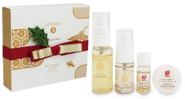 また、発売1周年を迎える金箔スキンケアシリーズ「GOLDAYS」から利用者の要望に応えたミニサイズ詰合せ「GOLDAYSはじまりBOX」(8500円)が登場。「金箔ジェルスプラッシュ(化粧水)」(20ミリリットル)、「金箔チャージセラム(美容液)」(10ミリリットル)、「さらりとうるおう美容オイル」(4ミリリットル)、「しなやかに保湿するフェイスクリーム」(5グラム)の4点をフルラインで試せる。