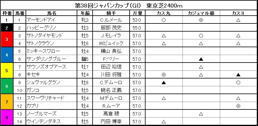 カスヨ わたしは△押さえよ。アーモンドは強い、強いというけど、今年の3歳牝馬のレベルが疑問なのよね。たとえば先月のエリザベス女王杯(京都、芝2200メートル)。あれだけ調子が悪いといわれてたモズカッチャン(4歳)が3着。3歳のなかでアーモンドアイに次いで強いとみられていたノームコアもカンタービレもモズカッチャンを抜けずに5着、6着だったわ。となると、これまでアーモンドが戦ってきた相手がどうもレベルが低い感じなのよね。もう一つは、オークスに勝ったから距離は大丈夫というけど、オークスとジャパンカップは距離は同じでも流れがまったく違うわ。残り800メートルくらいは激流になる場合が多いから、ついていけるかどうか疑問なのよね。