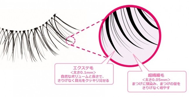 ナチュラルながらクッキリと仕上がる"オトナ盛りまつげ"が特長で、自まつげと同じ細さ(約0.05ミリ)の"超繊細毛"と、まつげエクステと同じ細さ(約0.1ミリ)の"エクステ毛"をMIXし、"ナチュラルなのにクッキリ"見える大人の理想のまつげを実現した。発表資料によると、異なる毛をMIXする、業界初の新製法を採用。熟練の職人が、ひとつひとつ丁寧に編み上げたという。