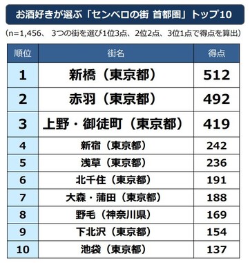 「飲みたい街ランキング2019」は2858人を対象に、「お酒好きが選ぶセンベロの街」は1456人を対象にそれぞれ上位3つの街を選んでもらい、1位3点、2位2点、3位1点で得点を算出、合計点の高い街から順位をつけた。
