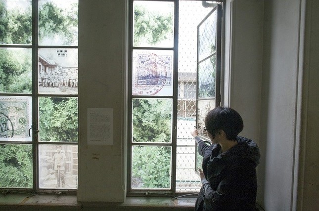 展示会場の窓に、日本人が住んでいたことを示すウバメガシ、大田に住んできた人が日本に送った当時の郵便物や消印をコラージュした(写真 渡辺誠) -