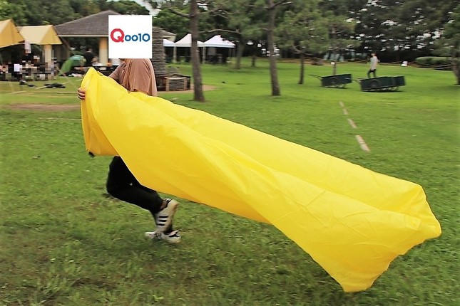 • 持参したエアーソファーを走って膨らませる、総合通販モール「Qoo10」担当者