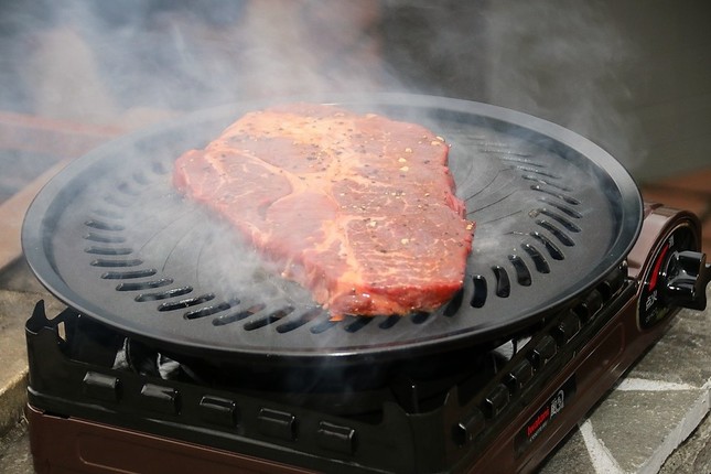 各担当者が手際よく調理開始だ。まず「公式BBQ」主催者の1人、Iwataniグループの「アイラップ」ツイッター担当者が持参した「岩谷産業」の網焼きプレートや焼肉プレートを広げ、カセットガスをテーブルにセット。