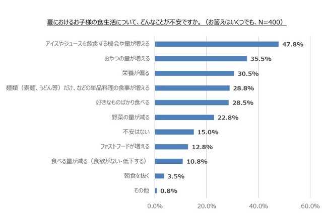 「夏休みの子どもの食生活についての不安の有無」では、全体の60.8%が「不安がある」と回答。具体的な内容として「アイスやジュースを飲食する機会や量が増える」(47.8%)が最多で、ほかにも「おやつの量が増える」(35.5%)、「麺類(素麺、うどん等)だけ、などの単品料理の食事が増える」(28.8%)、「野菜の量が減る」(22.8%)が多かった。