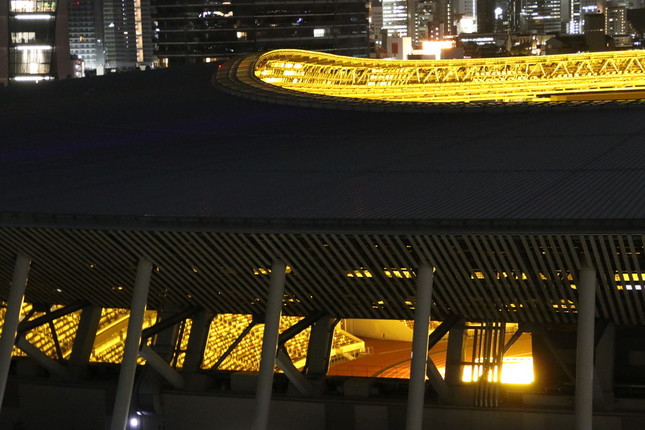 13階のオープンテラスに上がると、とっておきの眺望が待っている。完成を控えた新国立競技場を間近で見下ろせるのだ。金色にライトアップされた競技場の内部や、下にいるだけでは見えない曲線的な屋根の形状がよくわかった。