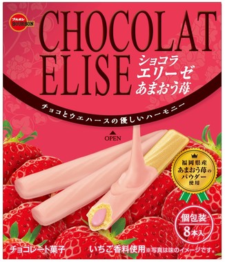 「ショコラエリーゼあまおう苺」は、ウエハースでイチゴクリームを包み、さらにイチゴチョコレートでコーティングしたスティックのウエハース。福岡県産の「あまおう」のパウダーを使用している。希望小売価格は180円(税別、以下同)。