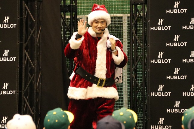 サンタ姿でサインボールをプレゼント