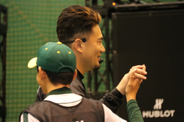 田中選手は子どもたちの投球を見守った。なかなか的に当たらず苦戦する子どもに「ナイストライ」「いい狙いやったよ」と励ましの言葉を送り、投げ終えるとすかさずハイタッチ。的が射抜かれると豪快なガッツポーズを見せ、子どもたちと一緒になって喜んだ。